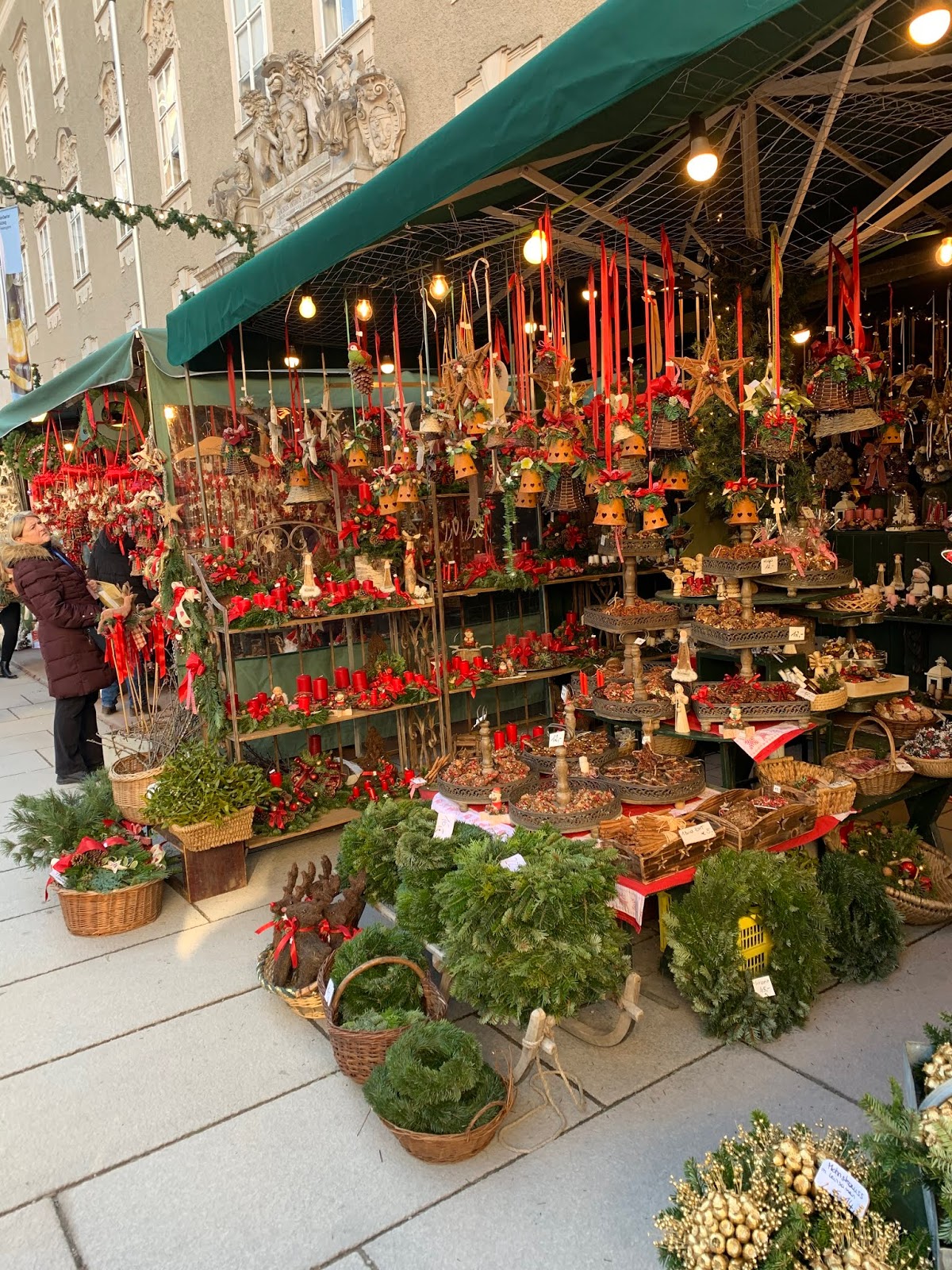 We found one of the largest Christmas markets today - Salzburg Christkindlmarkt. The kiosks held a lot of beautiful ornaments plus soaps, candy, and chocolate. The food kiosks were difficult to figure out as my German is pretty poor but most people speak English really well (I actually feel bad for the people coming from Italy or other countries who don't seem to speak German or English - they struggle). However, we saw strudels and pastries, glogg and bratwurst. Our lunch was pretty American, though - chicken burger and fries for me and a pulled beef sandwich for Bryan. We'll figure the food situation out better as we go!
